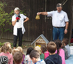 Und am 06.09.2012 war es soweit: Bei gutem Wetter und aufmerksam zuhörenden Kindern erklärte Gartenfreund Bernd Wolff den Kindern einige Arten der einfachen Unterkünfte für Nützlinge.